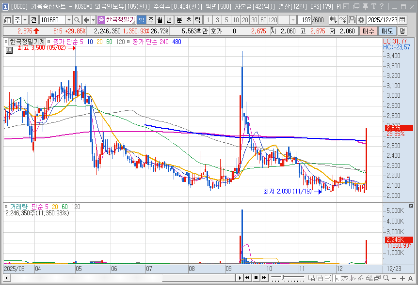 결론적으로 한국정밀기계는 "수출 호조를 통한 실적 개선"이라는 명분과 "품절주"라는 수급 조건이 완벽한 시너지를 낸 사례입니다.
