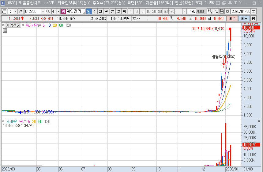 계양전기의 향후 전망은 대규모 수주 잔고와 로봇 시장 진출이라는 두 축을 중심으로 긍정적인 시각이 우세합니다. 그러나 투자자라면 반드시 경계해야 할 불안 요소도 있습니다. 첫째는 최근 급격한 주가 상승에 따른 단기적 과열 양상입니다. 단기간에 주가가 급등하면서 일부 투자 지표에서 고점 신호가 나타나고 있어, 신규 진입 시에는 눌림목을 활용한 분할 매수 전략이 필수적입니다.