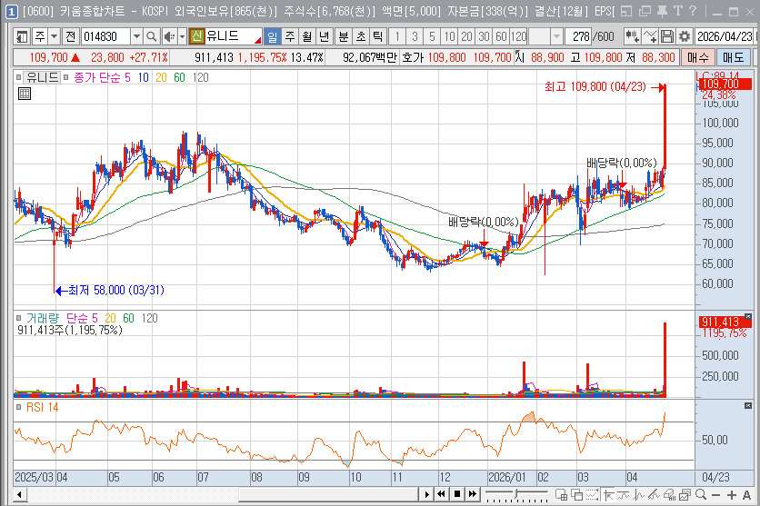 유니드는 현재 P/E 5배 내외, P/B 0.4배 수준의 극심한 저평가 구간에 위치해 있으면서도 현금 흐름이 우수하고 배당 매력까지 갖추고 있습니다. 실적 턴어라운드와 성장성이 동시에 확보된 종목에 대한 기관 특유의 가치 투자 성격이 반영된 결과로 풀이됩니다.