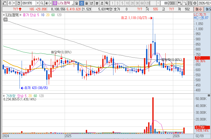 특히 지난 1월 30일 장중 9% 이상의 급등세를 보이며 이동평균선 정배열 전환을 시도한 점은 의미가 큽니다. 이는 단순히 일시적인 수급에 의한 반등이 아니라, 2025년 하반기부터 이어진 재무 건전성 회복 노력과 신규 수주 기대감이 주가에 투영되기 시작한 결과로 해석됩니다. 소재 산업의 특성상 전방 산업인 반도체와 디스플레이 업황의 개선은 나노캠텍의 실적 회복에 직접적인 트리거가 되고 있습니다.