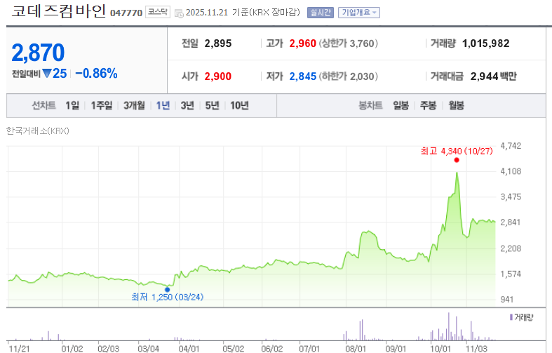 - 테마 민감도: 코데즈콤바인은 실제 사업 내용보다 테마성 으로 분류되는 경향이 강합니다. 따라서 남북 정상 간의 단발성 이벤트 나 외교적 제스처 에 주가가 매우 민감하게 반응하여, 다른 경협주보다 변동성이 극심할 수 있습니다.