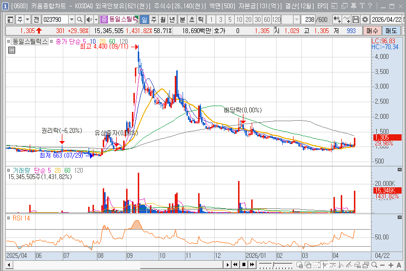 기술적 분석상 동일스틸럭스의 주가는 장기 하락 추세를 멈추고 5년 최저점 부근에서 강력한 바닥 지지선을 형성한 후 반등하는 초기 국면에 진입했습니다. 2026년 상반기 거래량이 폭발적으로 증가하며 매물대를 소화하는 과정은 대세 상승을 위한 에너지 응축 과정으로 볼 수 있으나 여전히 남아있는 순이익 적자 폭은 투자자가 경계해야 할 요소입니다. 원자재 수급 불안이나 글로벌 관세 전쟁 등 대외적인 변수 역시 주가에 변동성을 줄 수 있는 불안 요소이기에 공격적인 추격 매수보다는 눌림목 구간을 활용한 분할 접근이 유효합니다. 하지만 신사업의 안착과 조선 업황의 호조가 지속된다면 과거 고점 대비 현격히 낮은 현재 주가는 중장기 투자자들에게 매우 매력적인 진입 기회를 제공할 것으로 전망됩니다.
