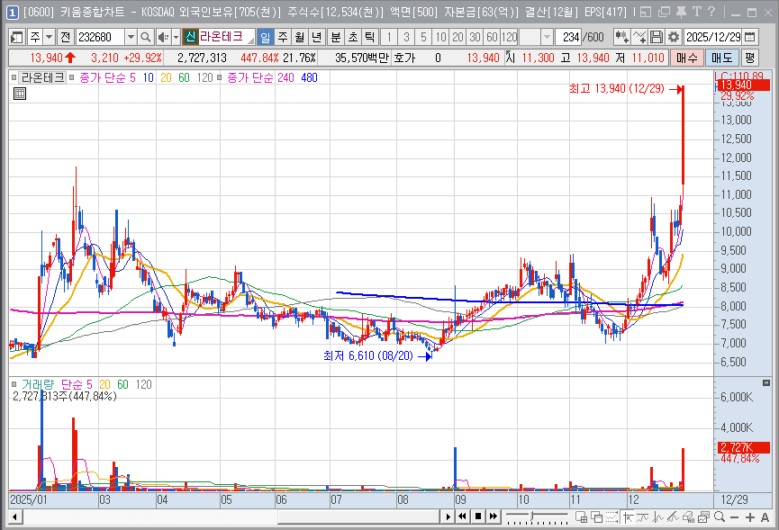 최근 바이오 의약품 생산 공정의 스마트 팩토리 도입이 가속화됨에 따라, 멸균 및 청정 환경에서 정밀한 핸들링이 가능한 라온테크의 로봇 시스템 수요가 꾸준히 발생하고 있습니다. 이는 반도체 업황의 주기적 변동성을 상쇄할 수 있는 강력한 보조 키워드로 작용하며 기업의 장기적인 멀티플 상승을 견인하고 있습니다.