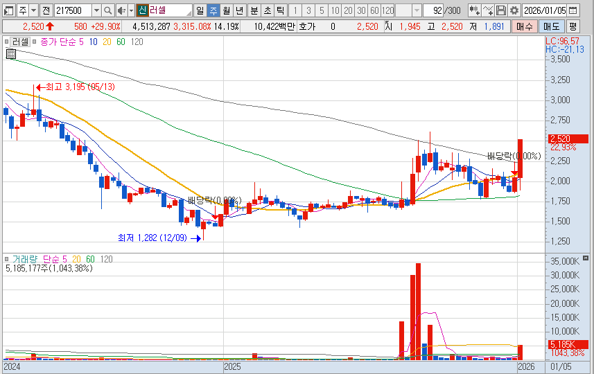 재무적인 관점에서 러셀은 과거의 실적 부진을 털어내고 체질 개선에 성공하고 있습니다. 2025년 하반기부터 영업이익률이 두 자릿수로 복귀하며 본업에서의 이익 창출 능력이 회복되었고, 부채 비율 또한 안정적인 수준으로 관리되고 있습니다. 특히 최근 3개월 이내에 발표된 리포트와 시장 데이터에 따르면, 5년래 최저점 부근에서 바닥을 다진 이후 거래량이 실린 우상향 추세를 보이고 있어 기술적으로도 매력적인 구간에 진입했습니다.
