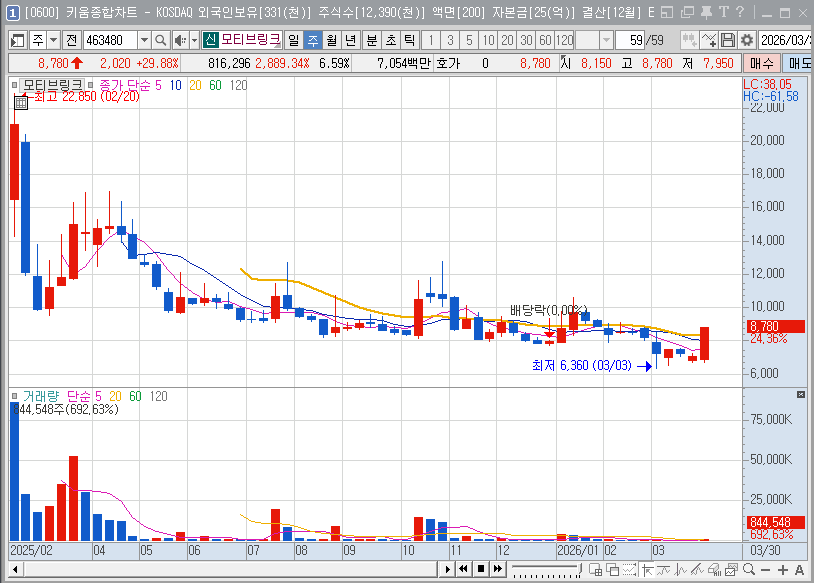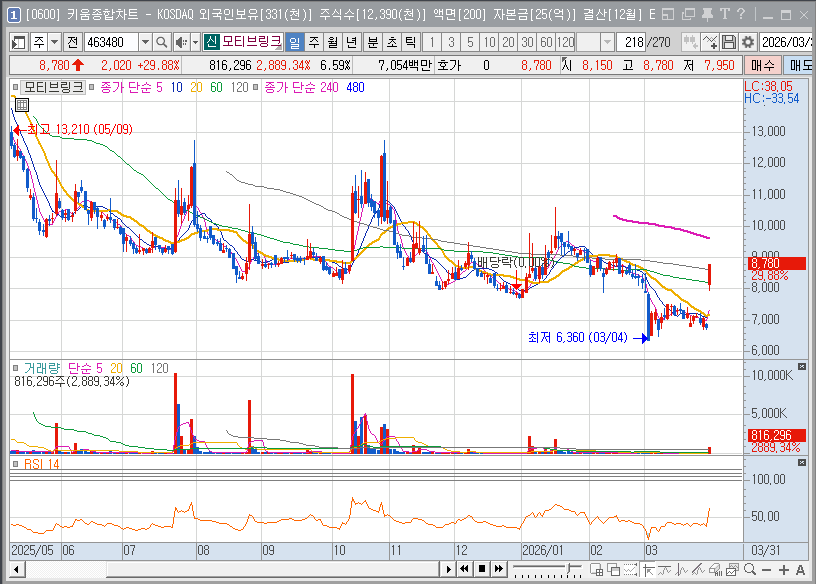 이번 상한가는 장기간 이어졌던 바닥권 횡보를 끝내는 강력한 신호탄으로 해석됩니다. 2026년 초 52주 신저가 부근까지 하락하며 과매도 구간에 진입했던 주가가 거래량을 동반하며 분출했다는 점은, 스마트 머니를 포함한 시장 주도 세력이 모티브링크의 저평가 매력과 성장 잠재력에 반응하기 시작했음을 의미합니다. 기술적 지표인 RSI 역시 낮은 수준에서 급격히 고개를 들며 추세 전환의 정석적인 모습을 보여주고 있습니다.