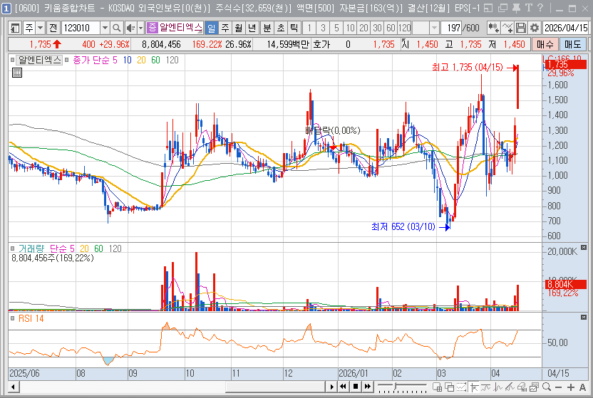 알엔티엑스의 전망은 바닥권을 탈출하여 강력한 상방 추세로 전환되는 변곡점에 위치해 있습니다. 이미지센서 업황의 회복과 신사업 기대감이 맞물려 최근 상한가를 기록하는 등 시장의 매수세가 집중되고 있습니다. 긍정적인 시나리오는 전장용 패키징 물량의 대규모 확대로 실적이 흑자 전환되는 시점에 주가가 본격적인 재평가 구간에 진입하는 것입니다. 다만 투자 관점에서 경계해야 할 불안 요소는 여전히 진행 중인 영업 적자 구조와 신사업 추진을 위한 자금 조달 리스크입니다.