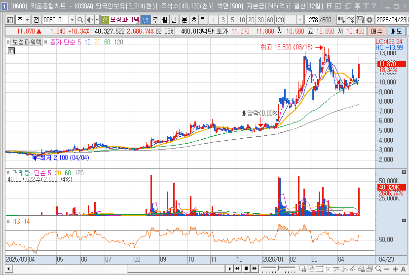 앞으로의 주가는 원전 수출의 최종 계약 체결 여부와 함께 실적 턴어라운드의 지속성에 따라 상방 변동성을 키울 것으로 보이지만 반드시 경계해야 할 불안 요소도 존재합니다. 2026년 4월 현재 보성파워텍은 원전 테마의 대장주격 움직임을 보이며 단기 급등에 따른 차익 실현 욕구가 강해진 구간에 진입해 있어, 수주 소식의 지연이나 정치적 변수에 따른 변동성 확대가 주가를 일시적으로 급락시킬 위험이 있습니다. 또한 여전히 높은 원자재 가격 유지와 글로벌 금리 인하 지연에 따른 인프라 투자 심리 위축 가능성은 실적 성장의 속도를 늦출 수 있는 요인이므로, 지지선 이탈 시 기계적인 대응을 병행하는 분할 매수 전략이 리스크 관리 측면에서 가장 합리적인 선택이 될 것입니다.