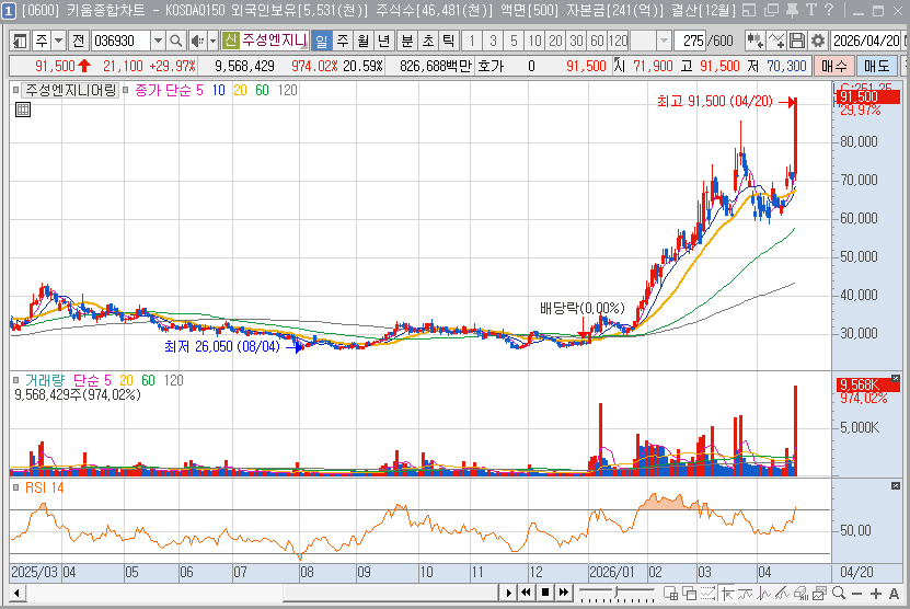 특히 2026년 4월 20일, 주성엔지니어링은 시장의 예상을 뛰어넘는 상한가를 기록하며 5년 내 신고가를 경신하는 기염을 토했습니다. 이는 단순히 반도체 업황 회복에 따른 수혜를 넘어, 그동안 준비해온 유리 기판용 장비와 HJT(이종접합) 태양전지 장비의 양산 준비가 완료되었다는 소식이 전해지며 강력한 매수세가 유입된 결과입니다. 또한 주주 환원을 위한 배당금 지급과 더불어 과거 논란이 되었던 기업 분할 이슈를 철회하고 내실 다지기에 집중한 경영 전략이 시장의 신뢰를 회복하는 결정적 계기가 되었습니다.