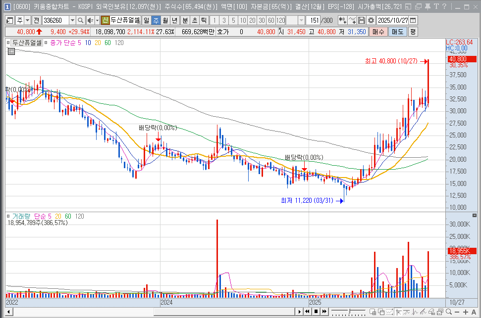 2025년 10월 28일, 두산퓨얼셀 주가가 갑자기 시원하게 상한가 를 찍었습니다.