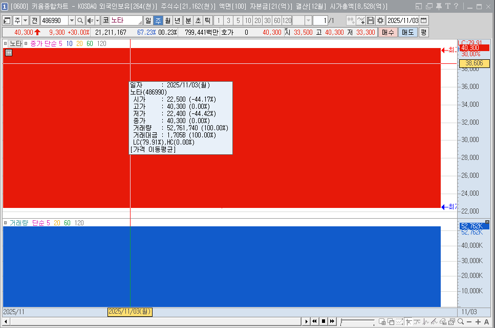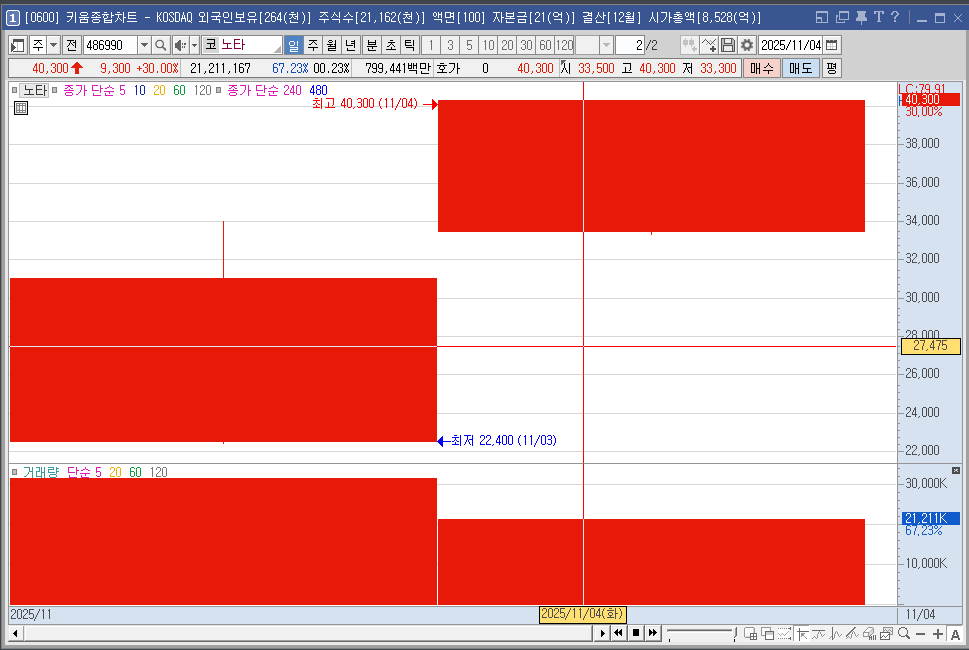 다만, 신규 상장주 특성상 변동성이 크기 때문에 노타 공모가 대비 현재 주가를 비교하며 냉정하게 접근해야 합니다.