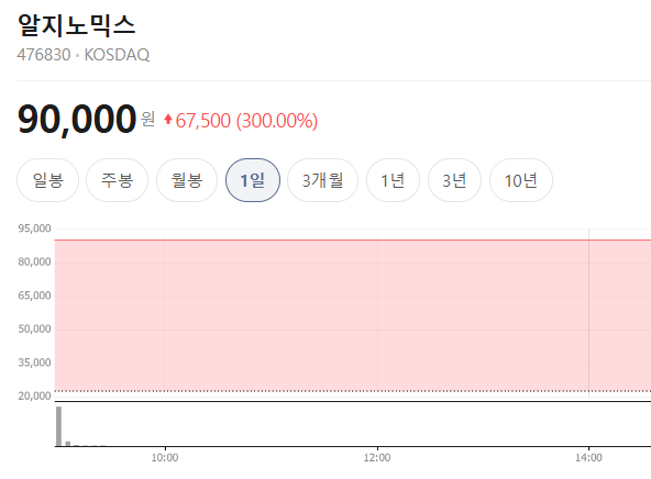 - 상장 첫날 '따따블' 기록 (2025.12.18): 공모가 22,500원으로 시작한 알지노믹스는 상장 첫날 장중 가격 제한폭인 300% 상승(90,000원)하며 이른바 '따따블' 대박을 터뜨렸습니다. 시가총액은 단숨에 1조 원을 돌파했습니다.