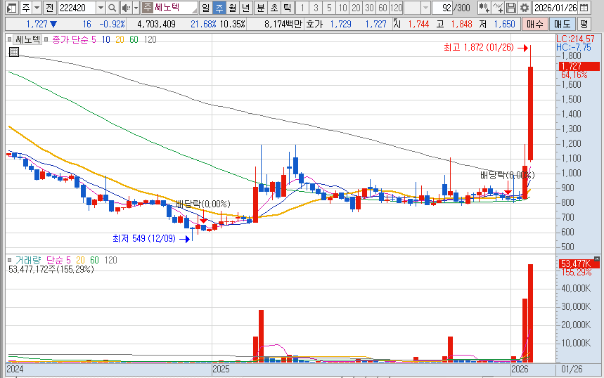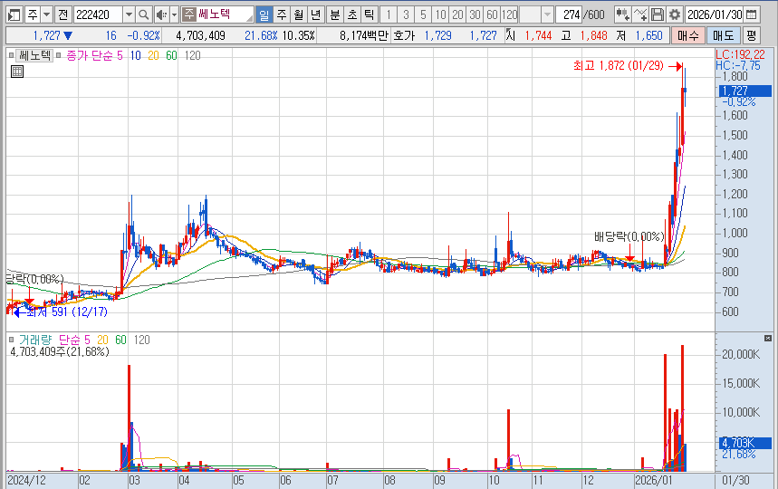 1월 29일 시장에서 희토류 및 2차전지 소재 관련주에 자금이 유입되면서 쎄노텍 같은 소재·부품주가 덩달아 강세를 보이고 있음.