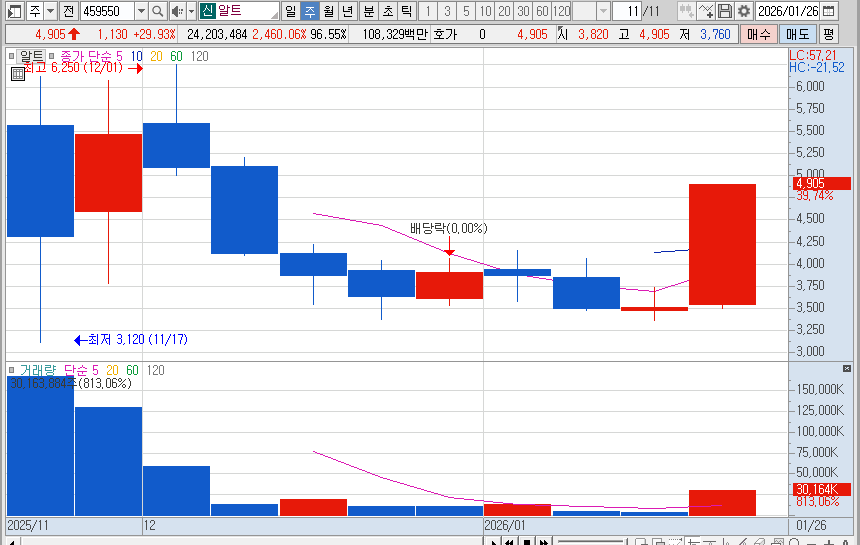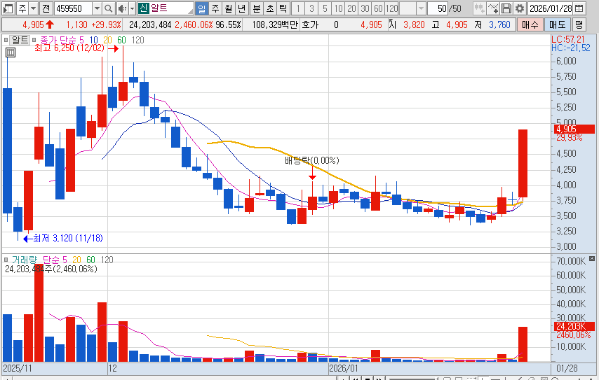 재무적 측면에서 알트는 소형주임에도 불구하고 비교적 견조한 펀더멘털을 유지해 왔습니다. 하지만 최근 52주 최고점이었던 6,250원 대비 현재는 상당한 가격 조정을 거친 상태입니다. 이러한 조정은 외적인 악재보다는 과도한 급등에 따른 피로감과 반도체 및 로봇 섹터의 일시적인 수급 공백에 기인한 것으로 보입니다. 시장 전문가들은 현재의 주가 구간이 기술적 지지선에 근접하며 하방 경직성을 확보하고 있다고 분석합니다.