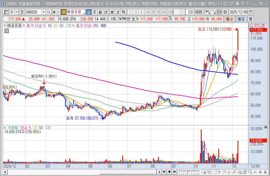 이 엄청난 호재 덕분에, 2025년 12월 8일 기준으로 에코프로 주가가 무려 +13.0%나 급등했고, 장중 VI(변동성 완화장치) 까지 발동되면서 난리가 났었죠.