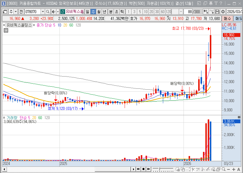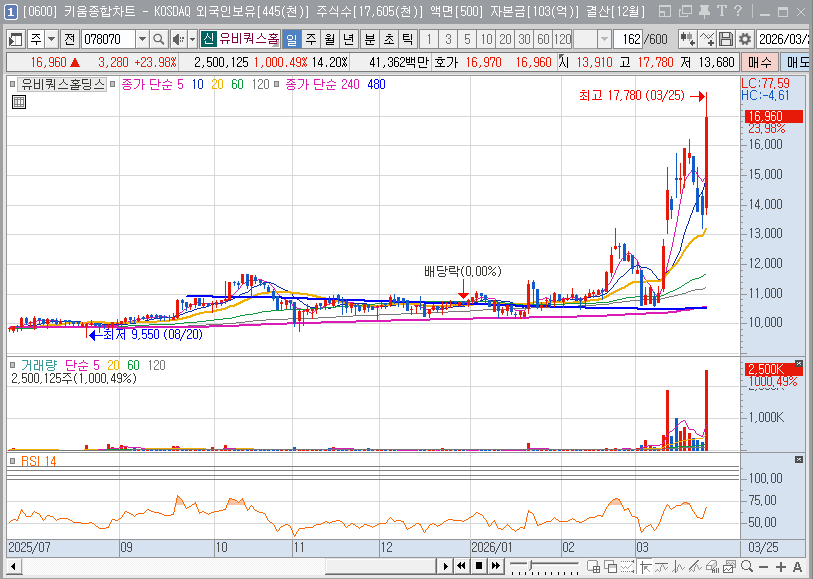 기술적 흐름상 유비쿼스홀딩스는 주요 이동평균선이 정배열을 이루며 장기 바닥권에서 우상향 추세로 완전히 돌아선 모습입니다. 최근 거래량이 실린 반등은 시장의 주도주가 부재한 상황에서 실적 기반의 저평가 가치주로 수급이 이동하고 있음을 시사합니다. 특히 최고투자책임자(CIO) 체제 하에 자산을 핵심(Core), 성장(Growth), 재무(Financial), 씨앗(Seed) 사업군으로 분류하여 효율적으로 관리하기 시작했다는 점은 단순 관리형 지주사에서 탈피하겠다는 강력한 의지로 읽힙니다. 이는 주가 측면에서 지주사 할인 요소를 해소하는 결정적인 요인이 될 것이며, 안정적인 배당 수익과 신사업의 성장을 동시에 누릴 수 있는 매력적인 투자처가 될 것입니다.