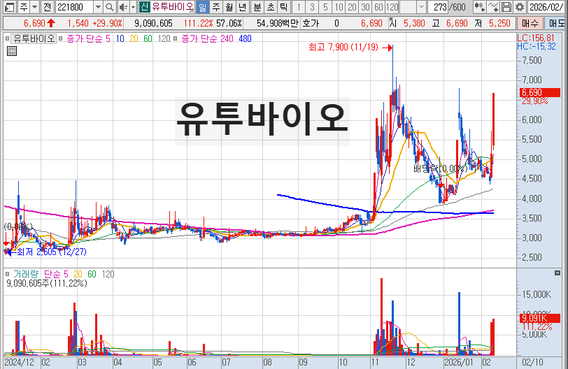 | 기술적 분석 | 바닥권 탈출 후 거래량 동반한 강력한 우상향 시도 | 2월 10일 기준 상한가 수준 급등 |