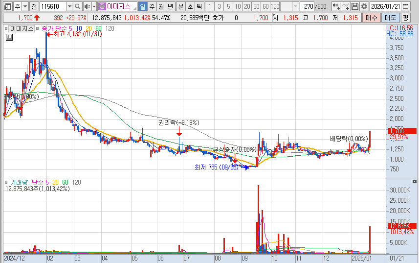 이미지스의 주가 전망은 실적 턴어라운드와 신사업 가시화라는 두 가지 축을 바탕으로 매우 긍정적입니다. 2026년 1월 기준 주가가 주요 저항선을 거래량과 함께 돌파하며 상한가를 기록하는 등 강력한 수급 유입이 확인되고 있습니다. 이는 과거의 적자 구조를 탈피하고 AI와 전장이라는 확실한 성장 동력을 장착한 것에 대한 시장의 신뢰가 반영된 결과입니다. 밸류에이션 측면에서도 신사업의 잠재력을 고려할 때 여전히 상승 여력이 충분하다는 평가가 지배적입니다.
