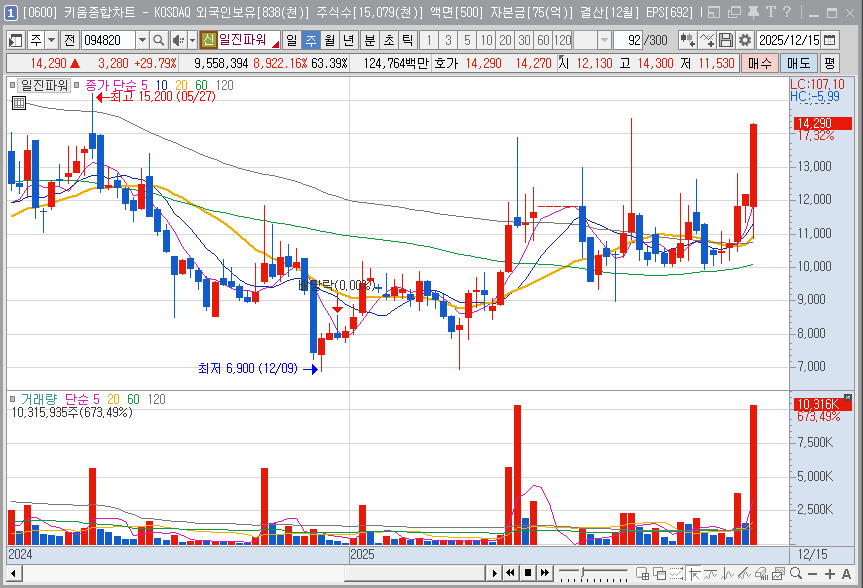 기술적으로 보면 일진파워는 2024년 말 6,900원이라는 바닥을 찍고 완벽한 상승 전환에 성공했습니다.