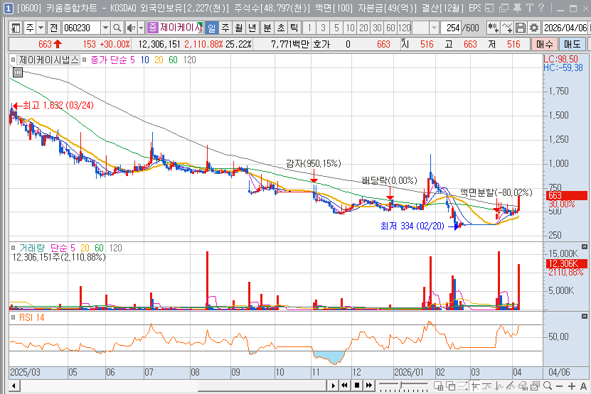 종합적인 관점에서 볼 때 제이케이시냅스는 위기 관리 단계에서 성장 모멘텀 확보 단계로 진입했습니다. 거래 재개 이후 수급 쏠림 현상이 나타나며 단기적으로 급등락을 반복하는 변동성을 보이고 있으나 이는 바닥권에서 물량이 회전하며 나타나는 전형적인 매집 과정의 특징이기도 합니다. 향후 로봇 사업의 구체적인 결과물이나 대형 고객사와의 공급 계약 소식이 전해진다면 주가는 강력한 우상향 추세를 형성할 동력을 얻게 될 것입니다.