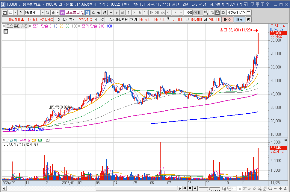 주가 급등 과정에서 외국인과 기관의 대규모 순매수 가 집중되었다는 점은 단순한 개인 투자자들의 투기적 매매가 아님을 시사합니다.