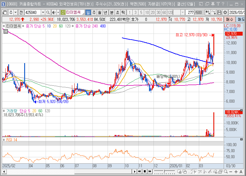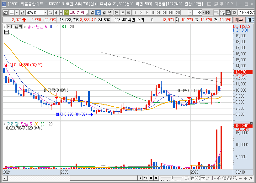 재무적 관점에서 티이엠씨는 2025년의 실적 부진을 딛고 2026년 상반기 본격적인 턴어라운드 국면에 진입했습니다. 2026년 2월 공시된 자기주식 처분 결정은 임직원들에 대한 성과 보상(RSU) 차원으로, 이는 경영진이 향후 실적 개선과 주가 상승에 대한 강한 자신감을 보유하고 있음을 시사합니다. 과거 업황 부진 시기에 반영되었던 악재들은 이미 주가에 선반영되었으며, 현재는 역사적 저점 부근에서 강력한 매수세가 유입되며 바닥을 다지는 모습입니다.