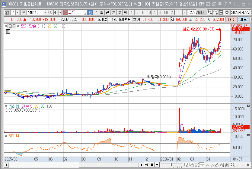 과거 상장 당시의 논란을 딛고 데이터센터용 SSD 컨트롤러 전문 기업 파두가 2026년 상반기 기록적인 실적 반등을 일궈내며 시장의 신뢰를 완벽히 회복하고 있습니다. 2026년 4월 27일 발표된 잠정 실적 공시에 따르면 파두는 올해 1분기 매출액 약 595억 원과 영업이익 약 77억 원을 기록하며 전년 동기 대비 매출은 200% 이상 급증했고 영업이익은 마침내 흑자로 돌아서는 쾌거를 달성했습니다. 이는 AI 데이터센터 인프라 구축 열풍으로 인해 고성능 저전력 저장 장치에 대한 수요가 폭발하면서 파두의 독자적인 컨트롤러 기술이 글로벌 하이퍼스케일러 고객사들로부터 대규모 선택을 받은 결과로 분석되며 주가 역시 이러한 실적 모멘텀을 반영해 4월 한 달간 50% 이상의 가파른 상승세를 기록 중입니다.