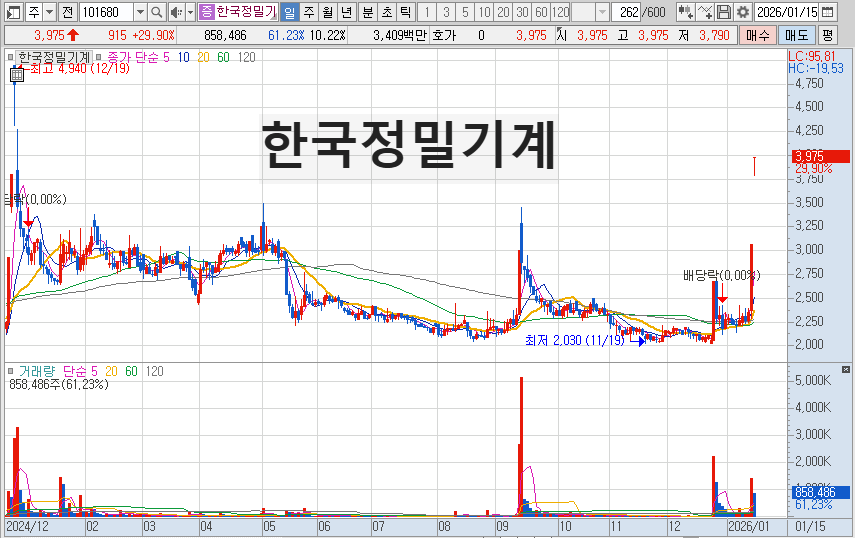 특히 과거 상장 유지 결정 이후 체질 개선에 주력해온 한국정밀기계가 이번 수주를 통해 실적 턴어라운드의 정점을 찍을 것이라는 분석이 지배적입니다. 대규모 수주 소식은 유동성이 적은 종목 특성과 맞물려 매수세가 집중될 때 폭발적인 주가 상승을 일으키는 전형적인 패턴을 보여주었습니다.