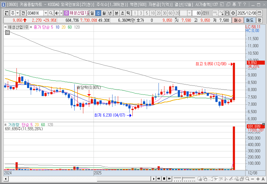 여기에 해성산업의 우선주(해성산업1우) 라는 특성이 더해져, 폭발적인 주가 탄력을 받고 있습니다.