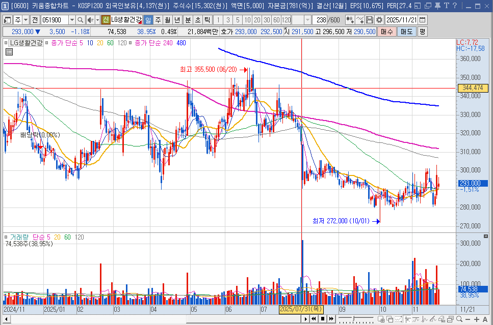하지만 최근 몇 년간 '더후(The history of 후)' 의 중국 매출 부진으로 주가가 크게 조정을 받았습니다.