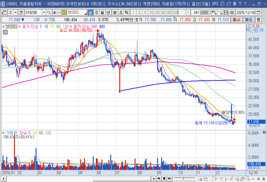 과거의 영광을 뒤로하고 체질 개선에 성공했습니다. 미국 시장에서 '코스알엑스(COSRX)'를 인수하며 북미 매출 비중을 획기적으로 높였고, 2025년 말 기준 영업이익 턴어라운드가 뚜렷합니다.