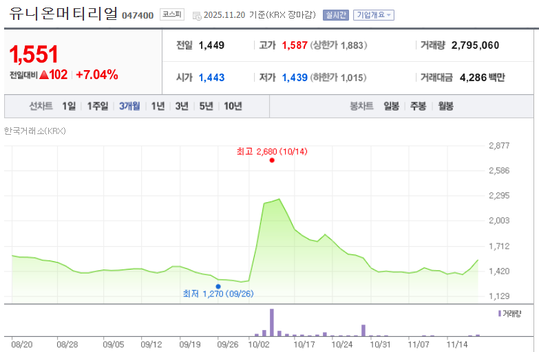 - 희토류 모멘텀: 자회사 유니온머티리얼 을 통한 희토류 대체재 시장 연관성이 큽니다. 국내에서 중국발 희토류 이슈가 터질 때마다 가장 강하게 반응하는 유니온 주가 의 특징이 있습니다.