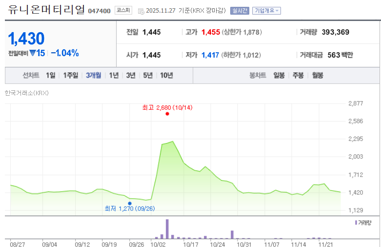반면, 유니온머티리얼 처럼 뉴스 발생 시마다 민감하게 반응하는 기업은 테마 수혜주로 보고, 철저한 기술적 분석과 단기적인 수급 변화에 집중해야 합니다.
