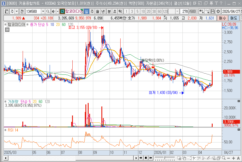 실적 턴어라운드와 강력한 성장 모멘텀에도 불구하고 주가 측면에서는 과거 고점 대비 크게 하락한 이후의 바닥 다지기 과정이 지속되고 있어 신중한 접근이 필요하며 특히 전환사채 물량 등 잠재적 오버행 이슈를 불안 요소로 꼽을 수 있습니다. 현재 주가는 5년 내 최저점 수준에서 횡보하며 추세 전환을 모색하고 있으나 적자 구조에서 이제 막 벗어난 단계인 만큼 분기별 이익 성장의 연속성을 반드시 확인해야 하며 글로벌 경기 둔화에 따른 콘텐츠 소비 위축 가능성도 염두에 두어야 합니다. 다만 최대주주인 탑코가 지속적으로 지분을 확대하며 70% 이상의 높은 지분율을 확보해 경영권을 공고히 하고 있다는 점은 수급적 안정감을 제공하며 장기적인 관점에서 웹툰 시장의 성장세와 맞물려 실적이 뒷받침될 경우 강력한 우상향 반등을 기대해 볼 수 있습니다.