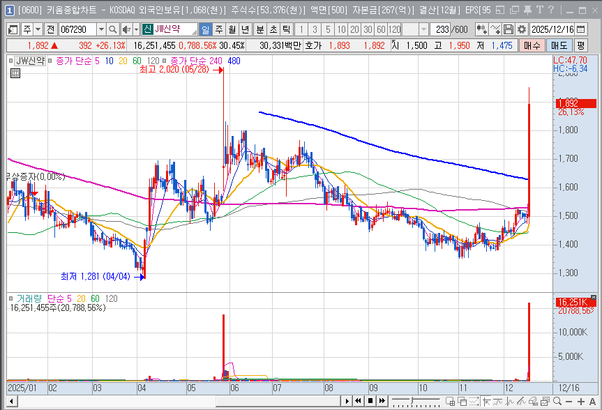 JW신약의 급등은 기업의 실적 공시가 아닌 , 정책 이슈가 시장의 거대한 투자 심리를 자극하고 수급이 폭발적으로 집중 되면서 나타난 전형적인 테마성 급등 으로 해석됩니다.