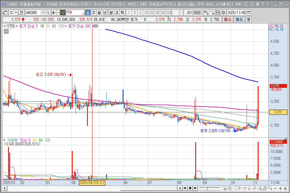 오늘 11월 6일, 드디어 YTN이 상한가를 찍어버렸습니다! 하루 만에 30% 급등이라니, 정말 속이 다 시원한데요.
